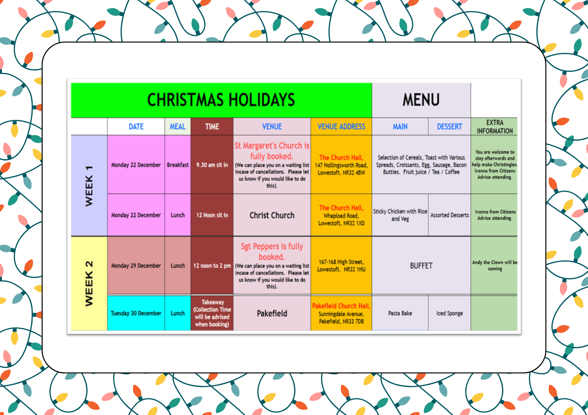 Our provision changes each holiday so please see the information below to find the venues and times that serve you the best and please remember we provide meals for the whole family, not just the children. We cannot serve children without adults present.