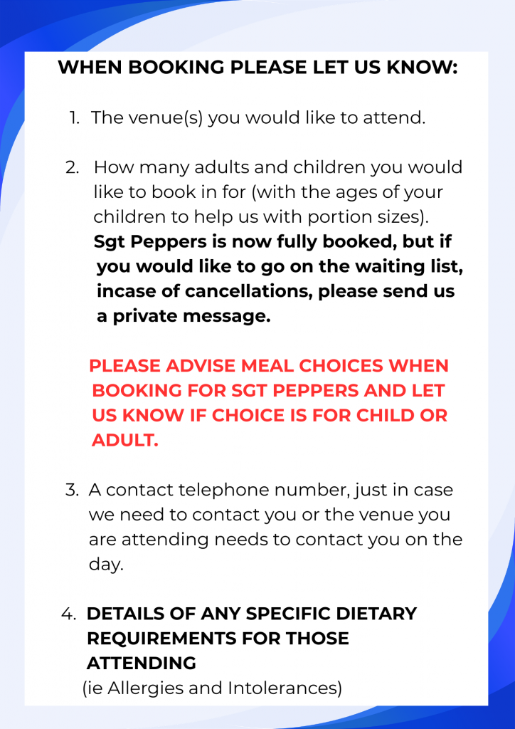 Please provide the venue and date of the session you require, Telephone number in case we need to contact you, full names of each person attending and any dietary requirements. Remember this provision is for the whole family not just the children.