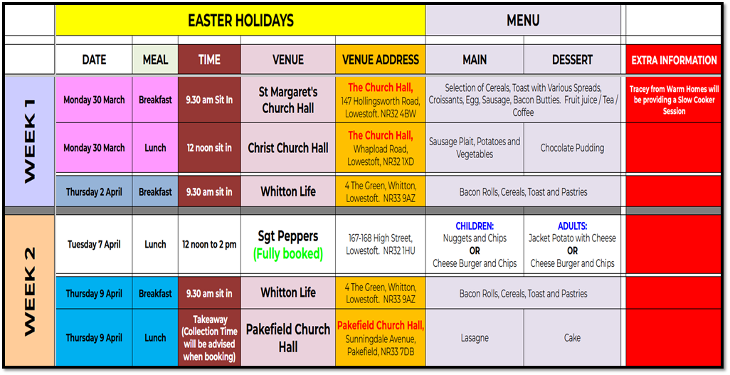 Our provision changes each holiday so please see the information below to find the venues and times that serve you the best and please remember we provide meals for the whole family, not just the children. We cannot serve children without adults present.